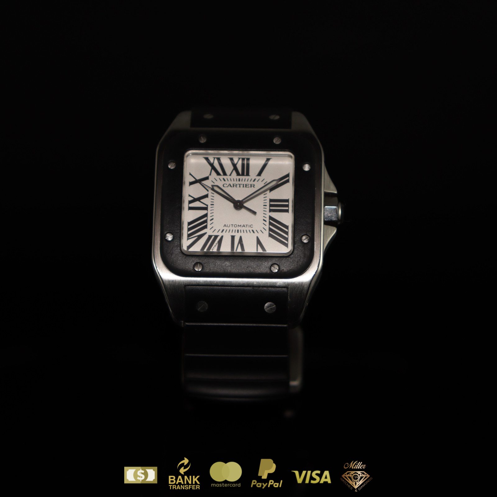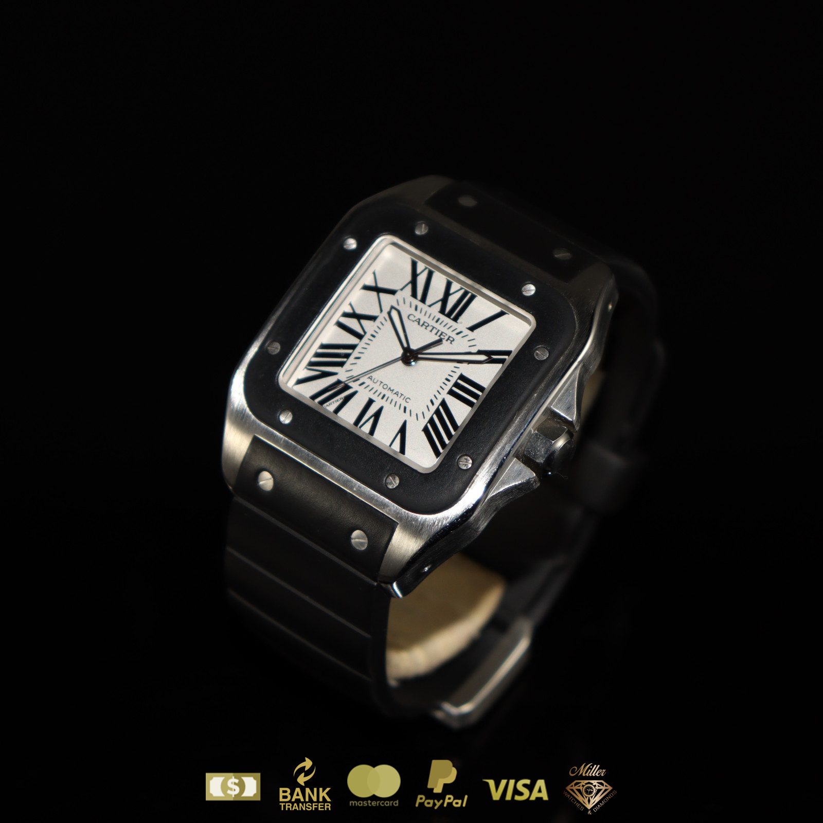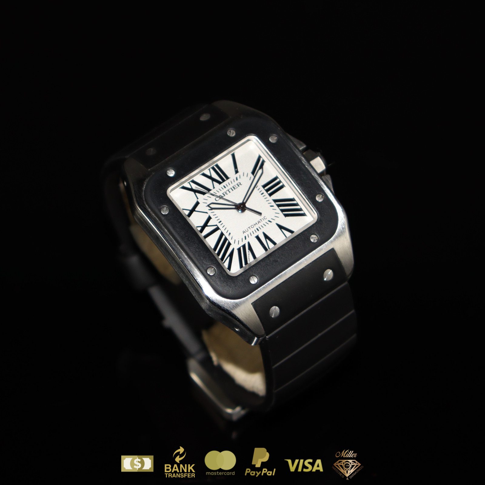 Cartier Santos 100 XL en acero inoxidable con correa de caucho negro y números romanos con caja y papeles.