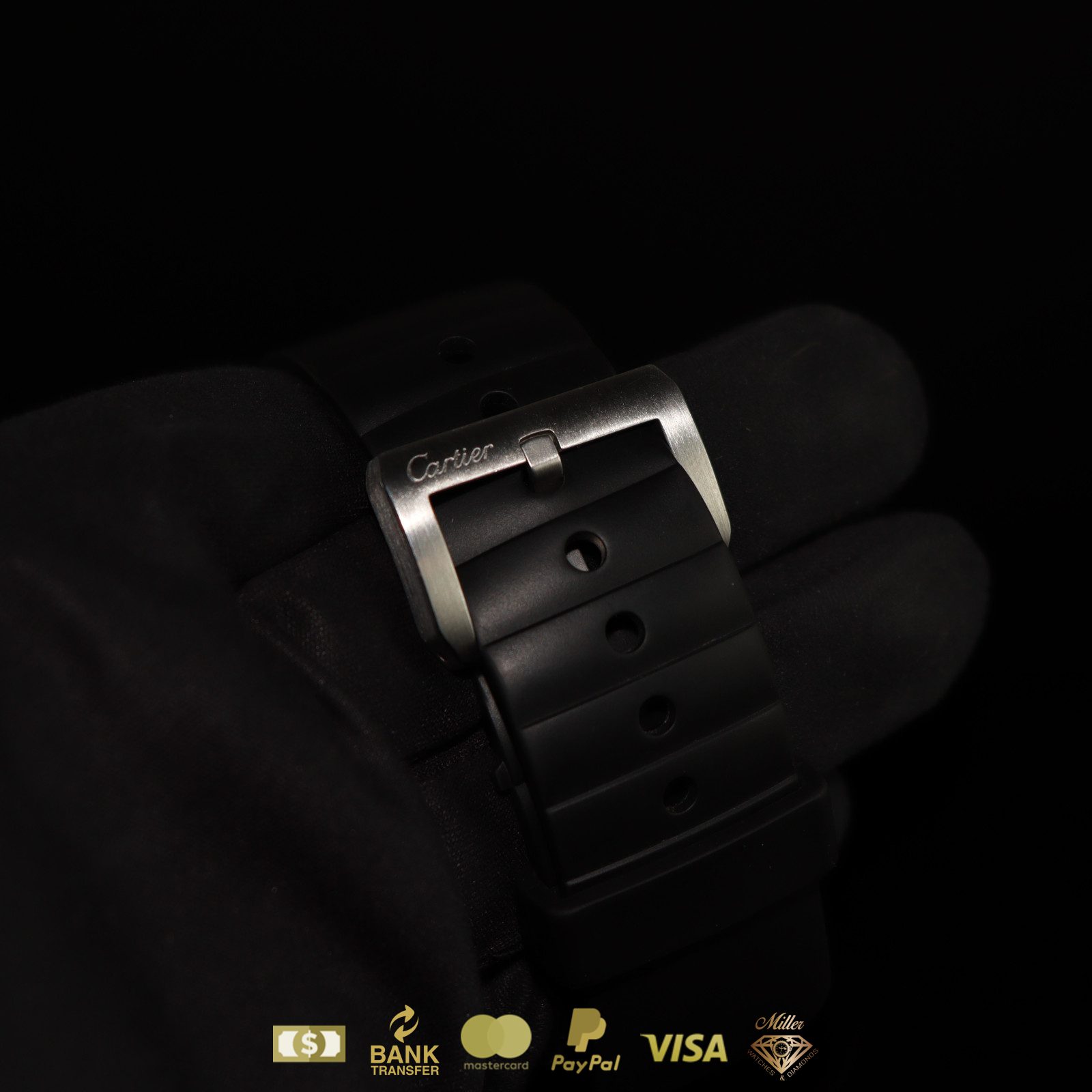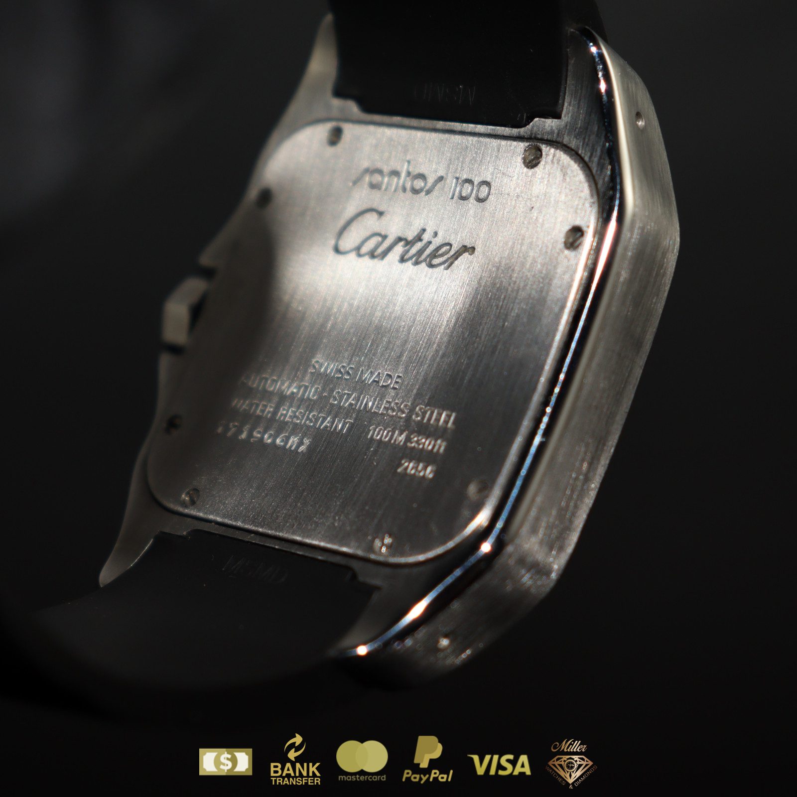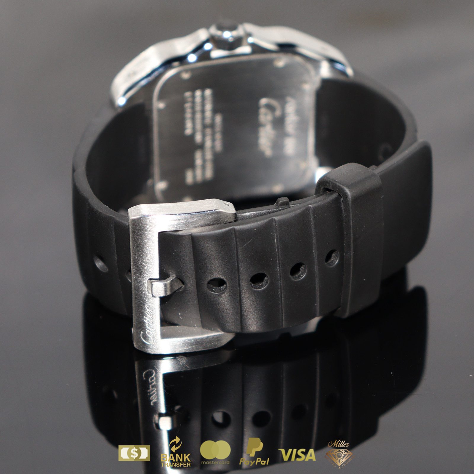 Cartier Santos 100 XL en acero inoxidable con correa de caucho negro y números romanos con caja y papeles.